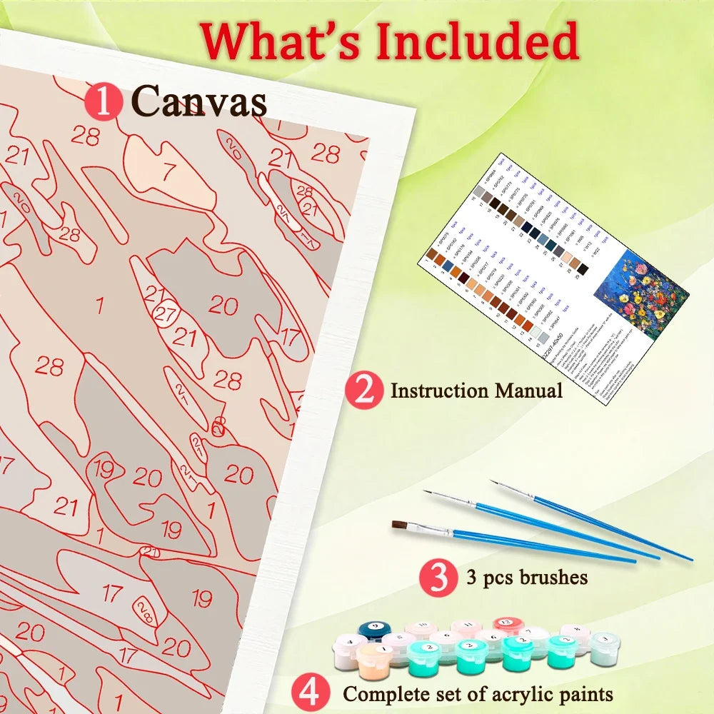 This paint-by-number kits include all the tools needed for painting, canvas*1, 3 brushes, paint, instruction manual