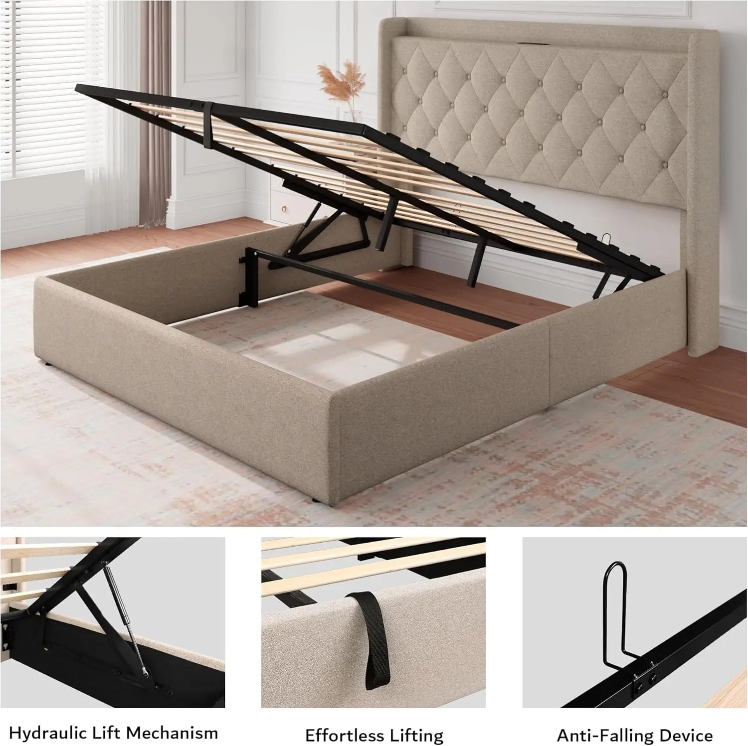 Hydraulic Lift System: Effortlessly raise the bed frame with headboard to reveal ample storage space using advanced hydraulic lift technology. Ideal for organizing and maintaining a tidy bedroom while maximizing utility