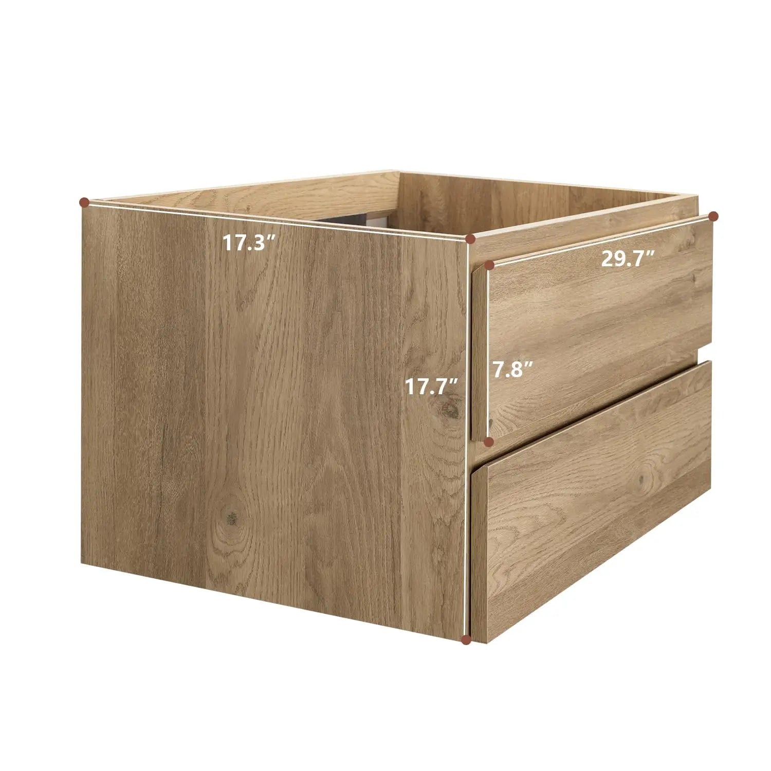 The 29.7"W x 17.3"D x 17.7"H floating vanity frees up floor space and visually enlarges small bathrooms. The elevated design simplifies mopping and prevents water damage to baseboards. Including 30"W x 18.5"L x 6.8"H high-quality ceramic sink is scratch and stain-resistant, ensuring long-lasting beauty and easy maintenance.