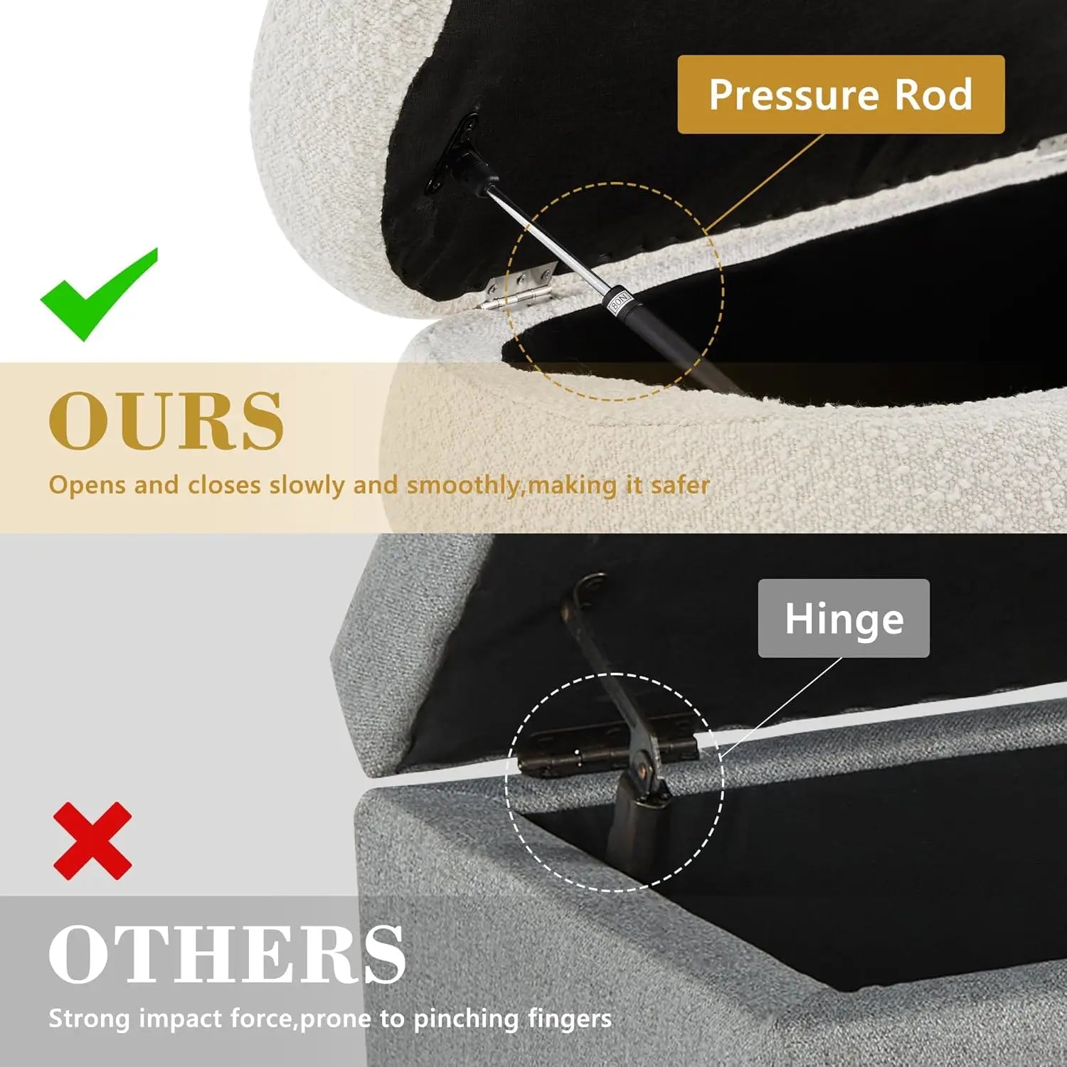 Featuring a secure pressure bar mechanism, the ottoman lid opens easily and safely. Its rounded edges are designed with safety in mind, especially beneficial for families with children, reducing the risk of injury during playtime.